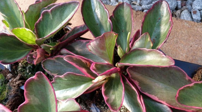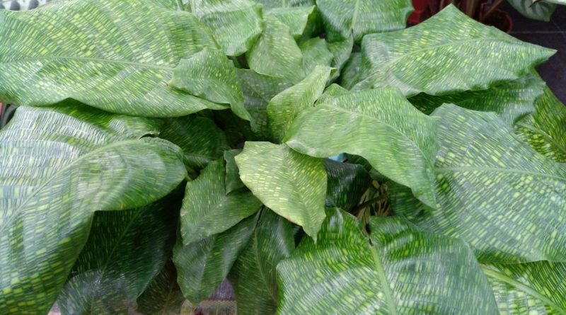 Planta tropical perenne. Hojas lanceadas con largos peciolos de color marrón rojizo o purpura. Hojas de color gris plateado con dibujos de color verde oscuro, envés de color purpura o marrón rojizo. Situación luminosa, suelo suelto, húmedo y bien drenado. Humedad ambiental alta y temperaturas moderadas invernales.