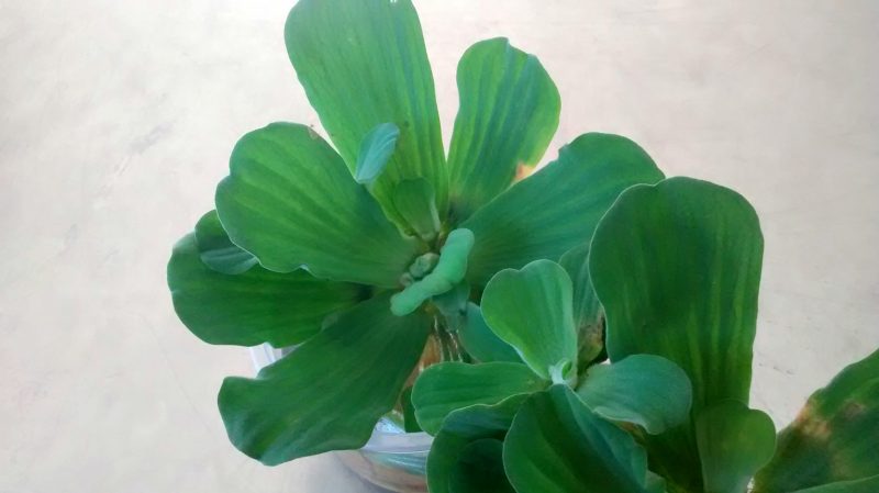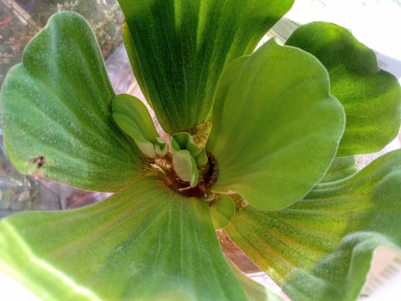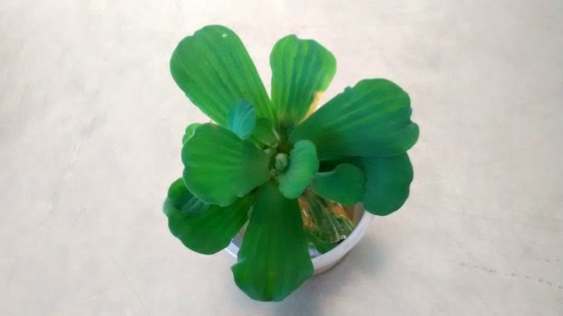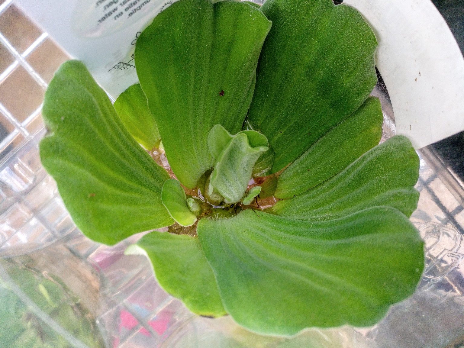 Es una planta acuática perenne flotante, forma rosetas de seis a cerca de veinte centímetros de diámetro, de hojas anchas y alargadas de color verde claro que pueden medir alrededor de diez centímetros de longitud; Las hojas son mas anchas y achatadas en el extremo superior, presenta los bordes superiores ondulados, tienen hendiduras verticales pronunciadas y están cubiertas por una fina vellosidad que atrapa pequeñas burbujas de aire y las ayuda a flotar. Las raíces se desarrollan en la parte inferior de la roseta y permanecen flotantes en el agua.