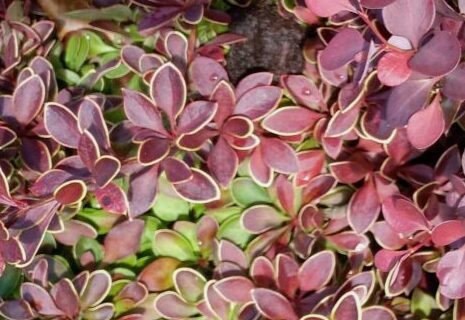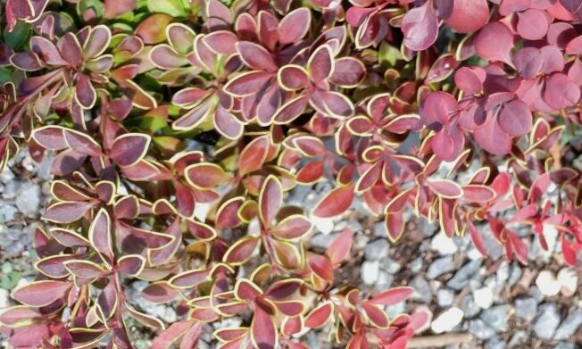 Las hojas surgen en primavera, son pequeñas y ovaladas, puntiagudas y caducas, de color purpura rojizo mas o menos intenso dependiendo de la época del año, los bordes de las hojas estan finamente dibujados de color dorado. Florece también en primavera, las flores de color naranja amarillento son pequeñas y se desarrollan a lo largo de los tallos, una vez fecundadas se transforman en pequeños frutos rojos y brillantes que maduran en otoño, los pájaros los ingieren.