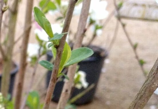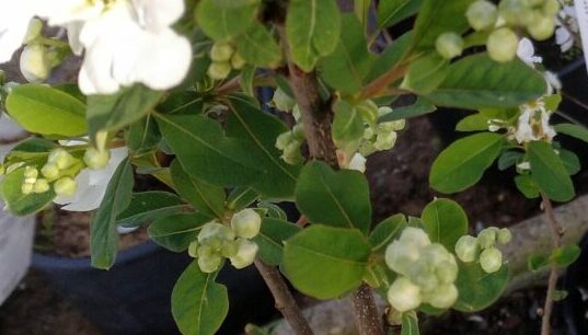 Los tallos de crecimiento vertical, son redondeados y leñosos, con corteza de color marrón grisácea, los tallos adultos se descaman. Las hojas son ovaladas y ligeramente puntiagudas, de color verde brillante, son caducas, adquieren tonos amarillos en otoño antes de caer. Las hojas presentan una linea longitudinal central hendida, de color verde pálido y nerviaciones secundarias menos pronunciadas. Las hojas miden entre tres y ocho centímetros de longitud y tienen los bordes lisos o ligeramente dentados, se desarrollan de forma alterna.