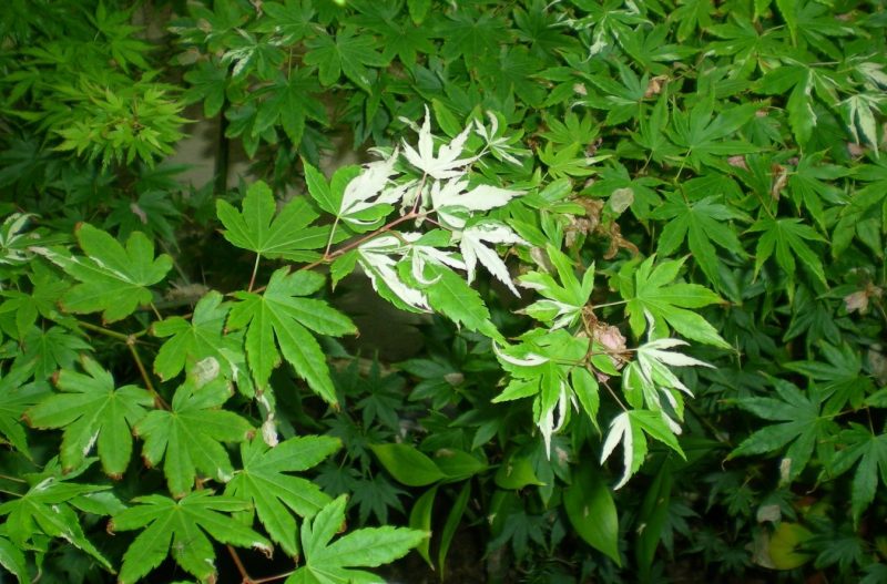 Las hojas son palmeadas, están divididas en sus extremos, en siete lóbulos lanceados y puntiagudos, de bordes irregulares. Las hojas brotan de color rosado, y van adquiriendo tonalidades verdosas, en primavera y verano. Son de color verde, pero algunas de ellas o su totalidad muestran dibujos de color blanco, mas o menos abundantes, y otras muestran tonalidades rosadas. Las hojas son caducas, pero en otoño antes de caer, adquieren magníficos tonos anaranjados y rojizos. Las flores son pequeñas y poco ornamentales, y los frutos pequeños y alados.