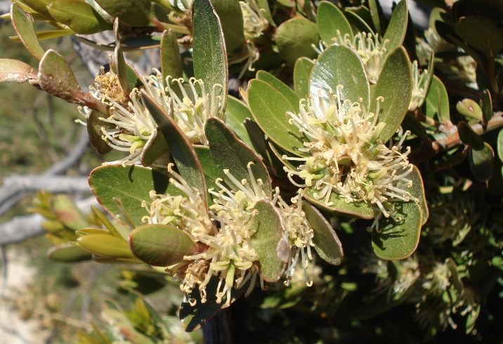 Tiene hojas ovaladas de color verde brillante por el haz y en un tono algo mas claro en el envés. Con temperaturas bajas las hojas adquieren tonos rojizos, estas son pequeñas y suelen ser perennes si no hace mucho frió. Su tronco es de color gris, las ramas jóvenes de color verde pero se vuelven marrones con el tiempo, cuando maduran.