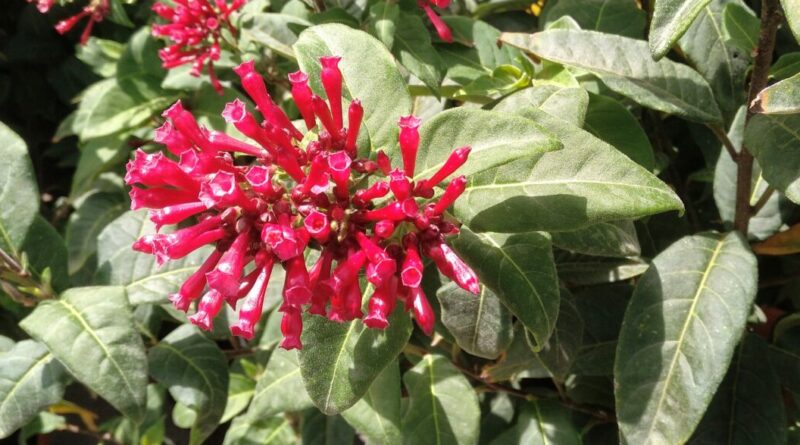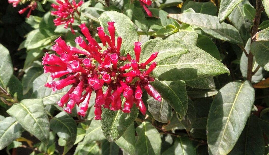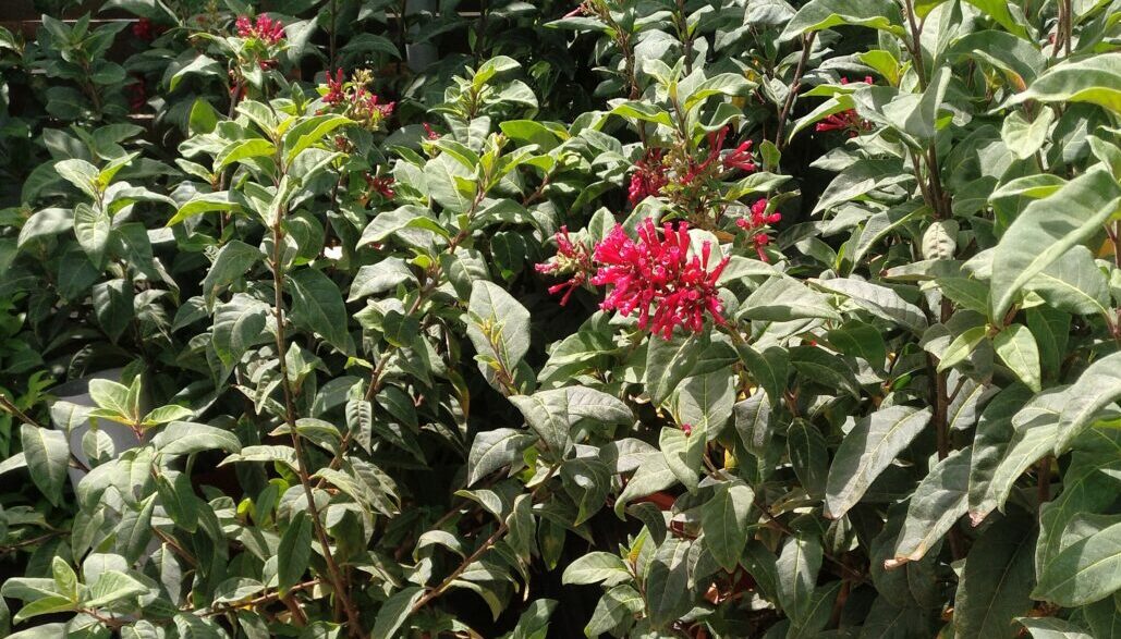 Florece en primavera y verano, las flores son tubulares y pequeñas, miden solo dos o tres centímetros de largo, crecen reunidas en inflorescencias redondeadas u ovaladas que aparecen en el extremo de los tallos. Las inflorescencias son muy llamativas por el color rojo intenso de su pequeñas flores. Las flores fecundadas dan frutos en forma de bayas rojas o purpuras, con pequeñas semillas marrones en su interior.