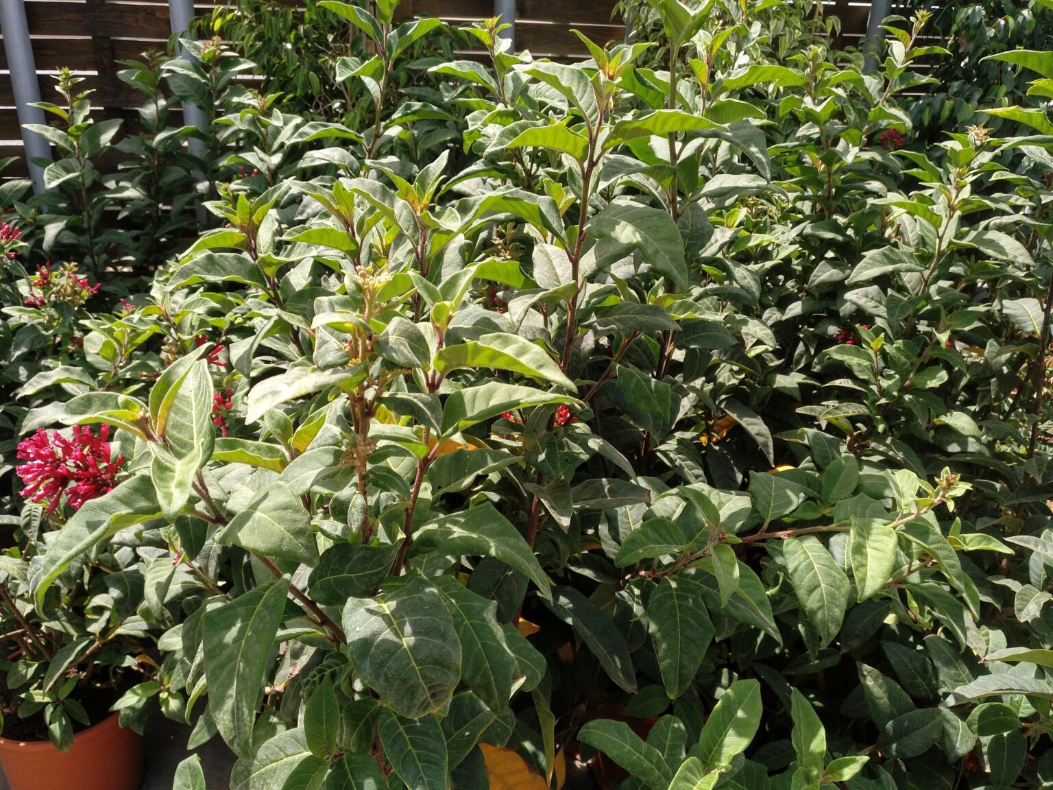 Los tallos de color marrón y mas claros en el nuevo crecimiento son largos y redondeados, están cubiertos de una fina vellosidad. Las hojas son perennes, se disponen de forma alterna sobre los tallos, son alargadas y presentan un peciolo corto, son de color verde oscuro con nerviaciones de color verde pálido. Las hojas son alargadas y puntiagudas, gruesas, están cubiertas de una fina vellosidad y tienen los bordes ligeramente dentados, miden entre diez y catorce centímetros de longitud.