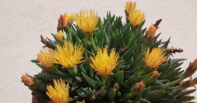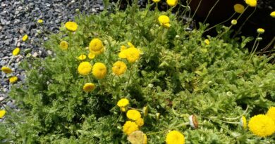 Florece de finales de primavera a finales de verano, las flores se desarrollan en solitario o en pequeños grupos, en el extremo de los tallos. Las flores tienen tienen cinco pétalos ovalados, de color amarillo dorado y numerosos estambres de color amarillo sobresalientes.