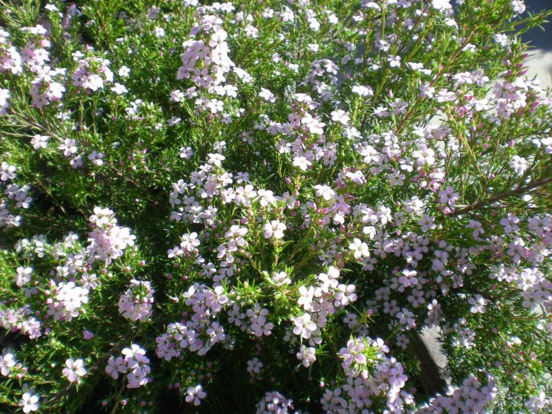 Florece abundantemente desde mediados de invierno hasta mediados de primavera. Sus flores de apariencia delicada, son muy pequeñas no llegan al centímetro de diámetro. Tienen cinco estambres y forma de estrella con cinco pétalos, de un color rosa pálido muy bonito, son perfumadas, contienen aceites esenciales. La floración es muy abundante cubriendo la planta casi por completo. Las flores atraen a las mariposas, abejas y abejorros. En otoño maduran sus frutos, son muy pequeños en forma de capsulas, se abren para que puedan salir sus cinco pequeñas semillas de color negro.