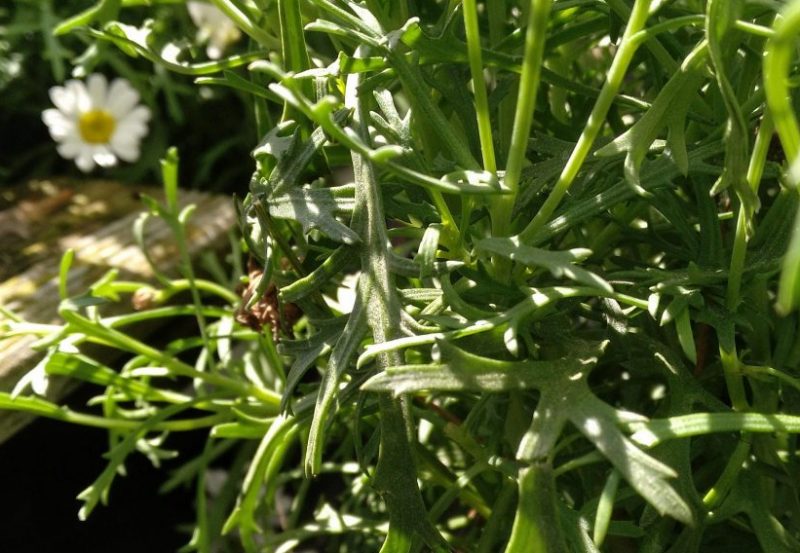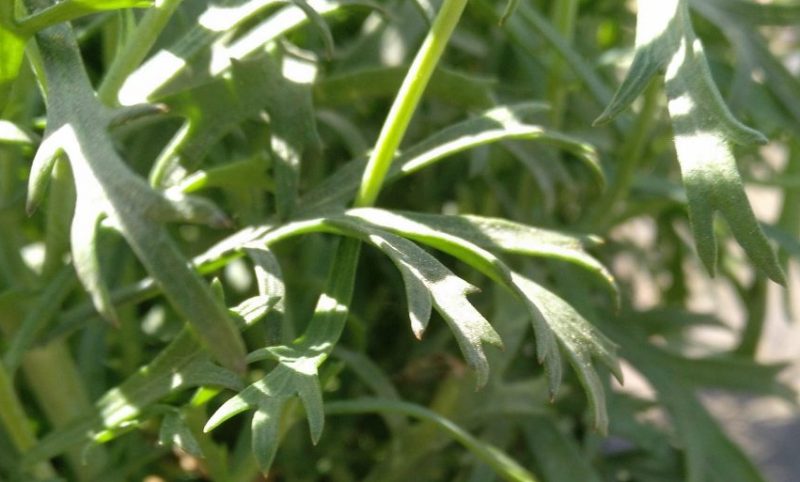 Sus tallos se desarrollan de forma vertical y son muy ramificados, son de color verde y redondeados, con la madurez se vuelven leñosos, de color marrón. Sus hojas son compuestas, lobuladas y muy segmentadas, de color verde por el haz y de un tono verde grisáceo por el envés.