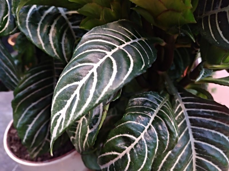 Sus tallos son gruesos y carnosos en los que se desarrollan grandes hojas alargadas de forma acorazonada, brillantes y de bordes lisos, de diez a veinticinco centímetros de longitud y entre seis y ocho centímetros de anchura, las hojas son gruesas y enteras, crecen de forma opuesta sobre el tallo, son de color verde oscuro con nerviaciones anchas de color blanco muy decorativas.