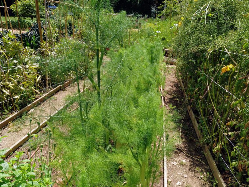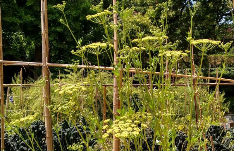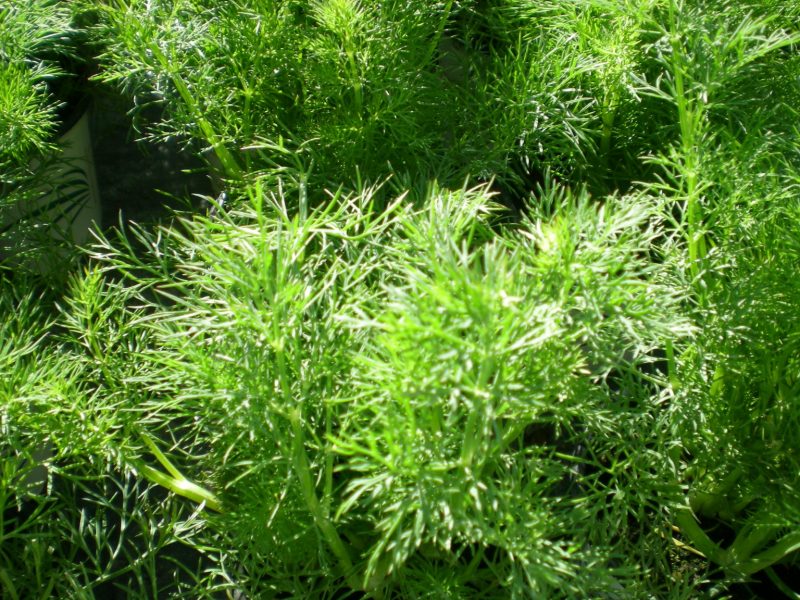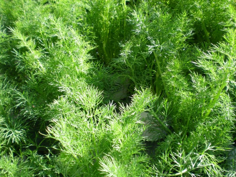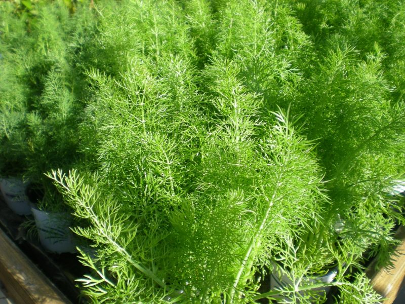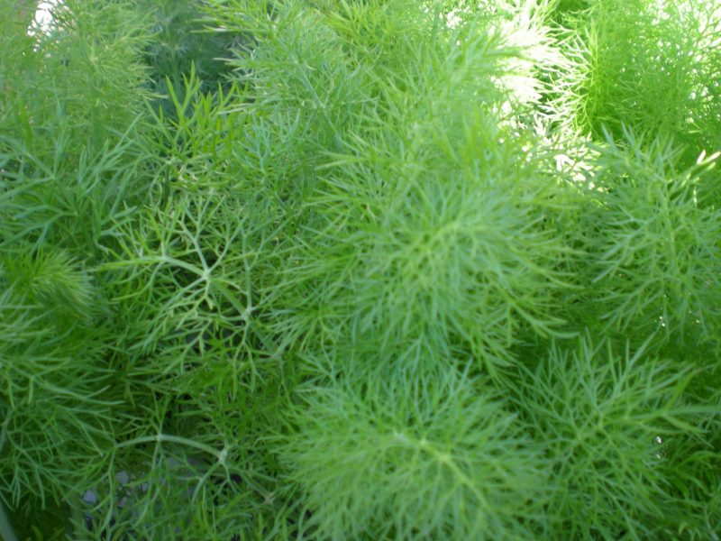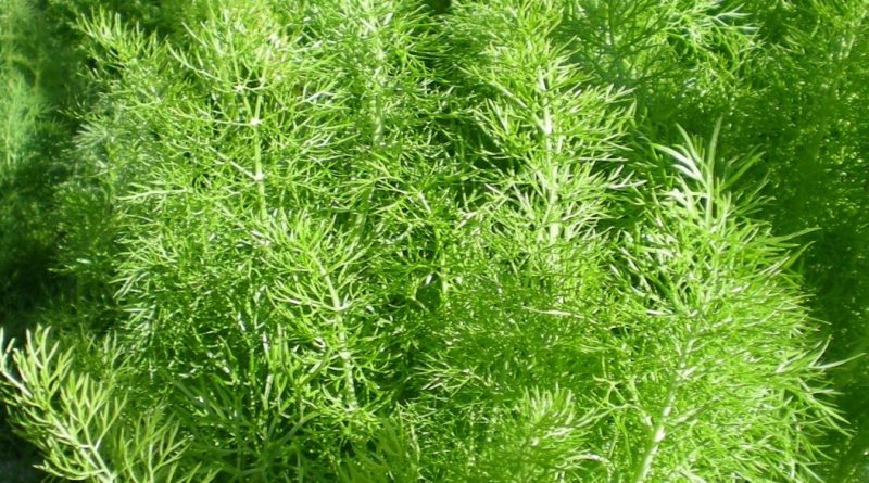 Sus hojas son grandes compuestas, divididas en segmentos muy finos que tiene forma de aguja, son de color verde brillante. Todas las partes de la planta son muy aromáticas, el aroma es anisado y refrescante. Sus finas hojas tienen la apariencia de una cabellera en primavera.