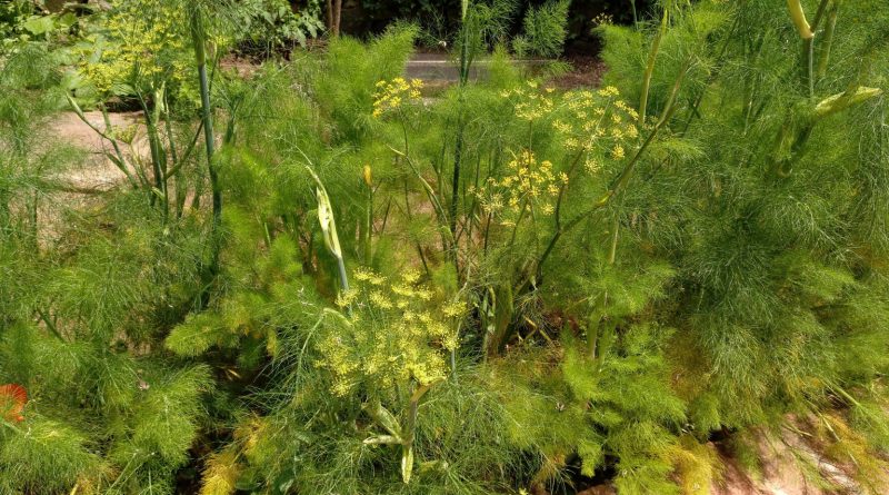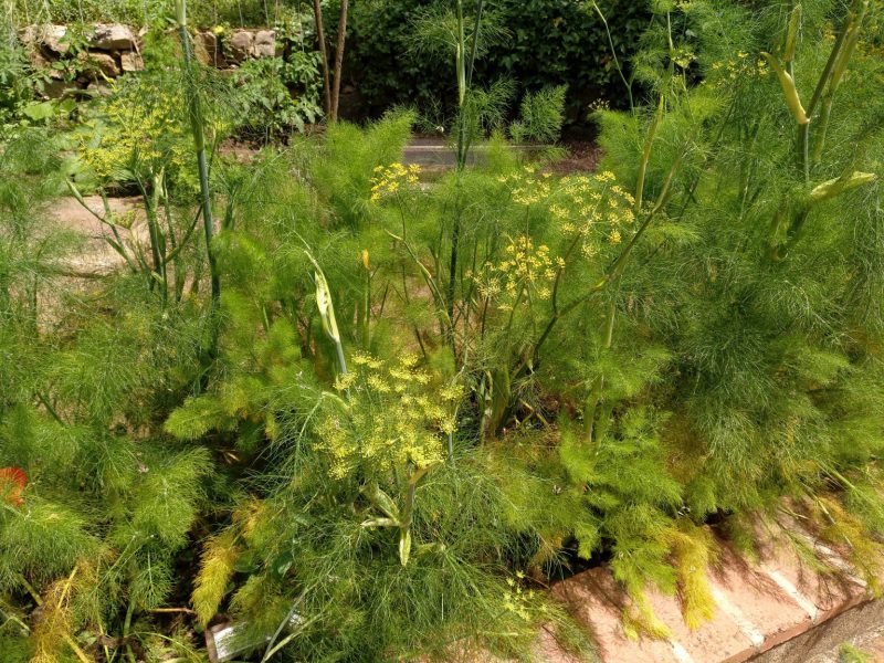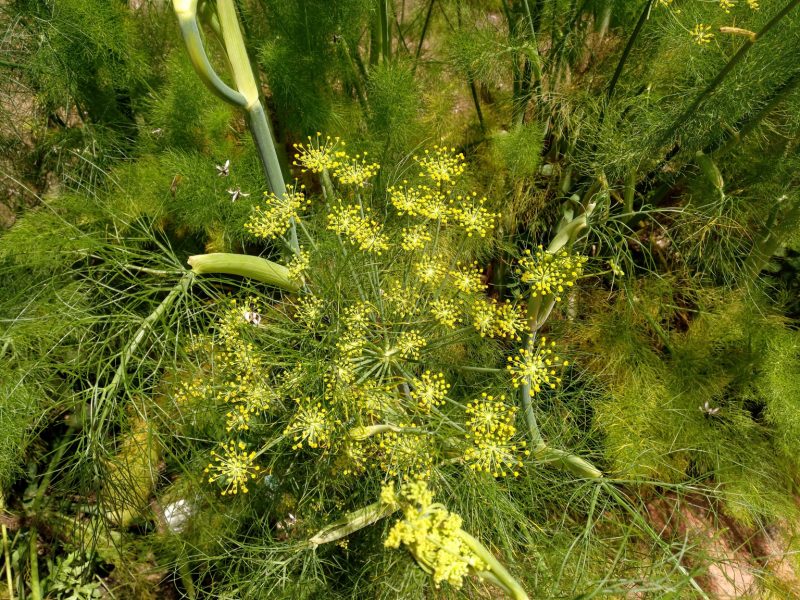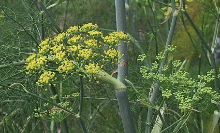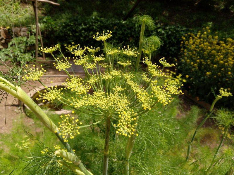 El Hinojo suele florecer en verano, entre julio y agosto, si el clima es cálido puede florecer también en otoño. Las flores son muy pequeñas de color amarillo, surgen reunidas en pequeños grupos redondeados y aplanadas, llamadas umbelas. Las umbelas son grandes, en forma de sombrilla, los tallos florales desarrollan solo unas cuantas umbelas primarias. Después de fructificar la parte aérea de la planta se seca, para brotar de nuevo en primavera.