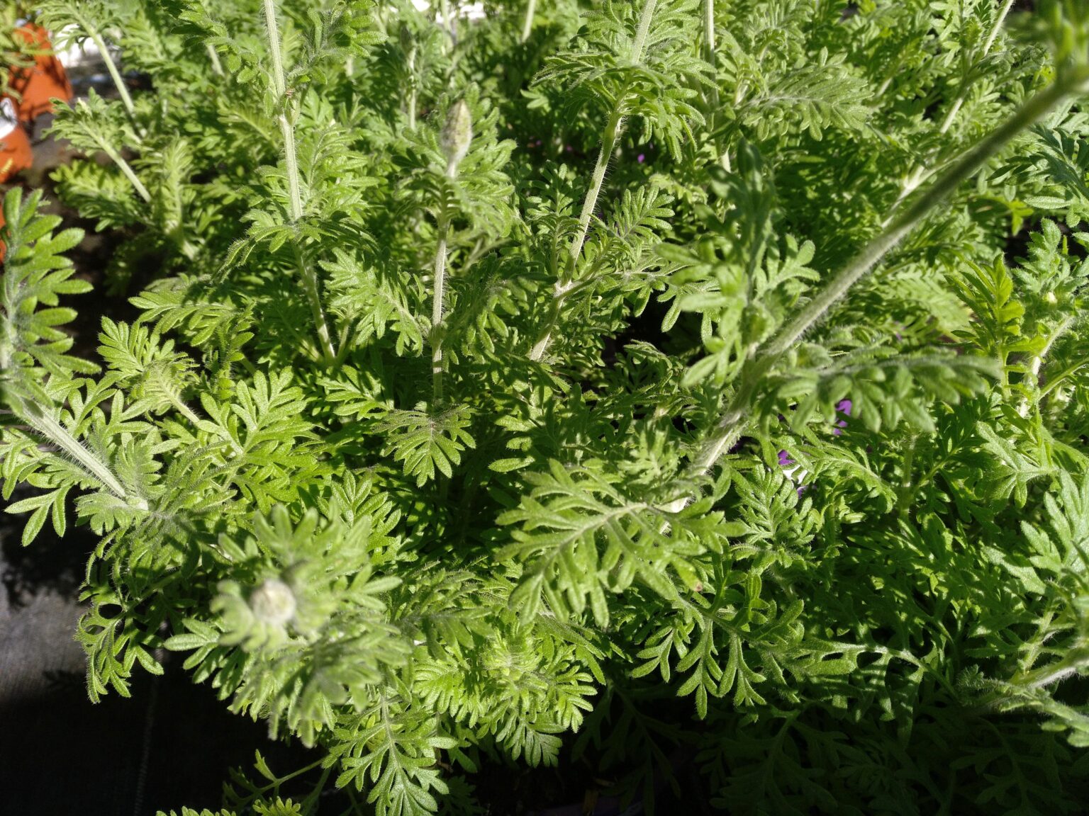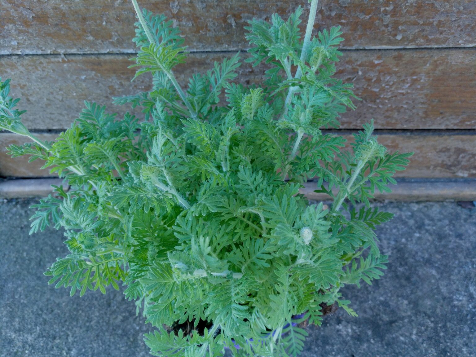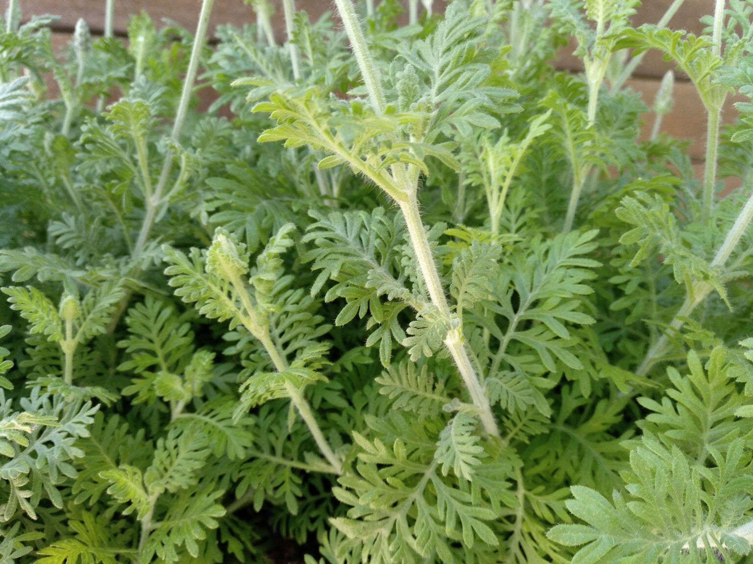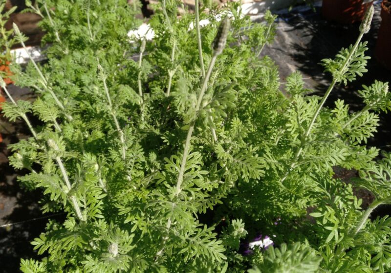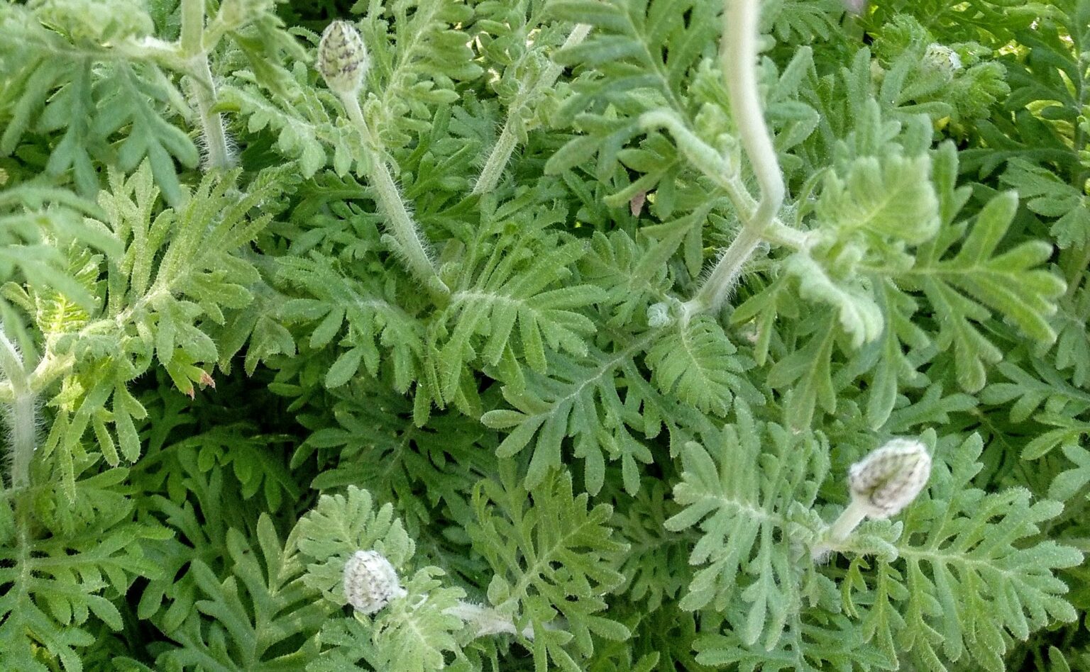 Los tallos son de color verde pálido, tienen forma cuadrangular y son redondeados en las aristas, están cubiertos por una fina pilosidad de color verde claro, que les da una apariencia blanquecina. Las hojas son de color verde pálido, grisáceo o amarillento, tienen forma triangular, son mas anchas en su base y se van estrechando hacia los extremos, están muy divididas en segmentos o lóbulos ovalados, que a su vez se dividen en sus extremos, (similares a las hojas de los Helechos). Las hojas están cubiertas por una fina vellosidad, mas corta que la vellosidad de los tallos y de los pedúnculos o tallos florales. La planta es muy aromática.