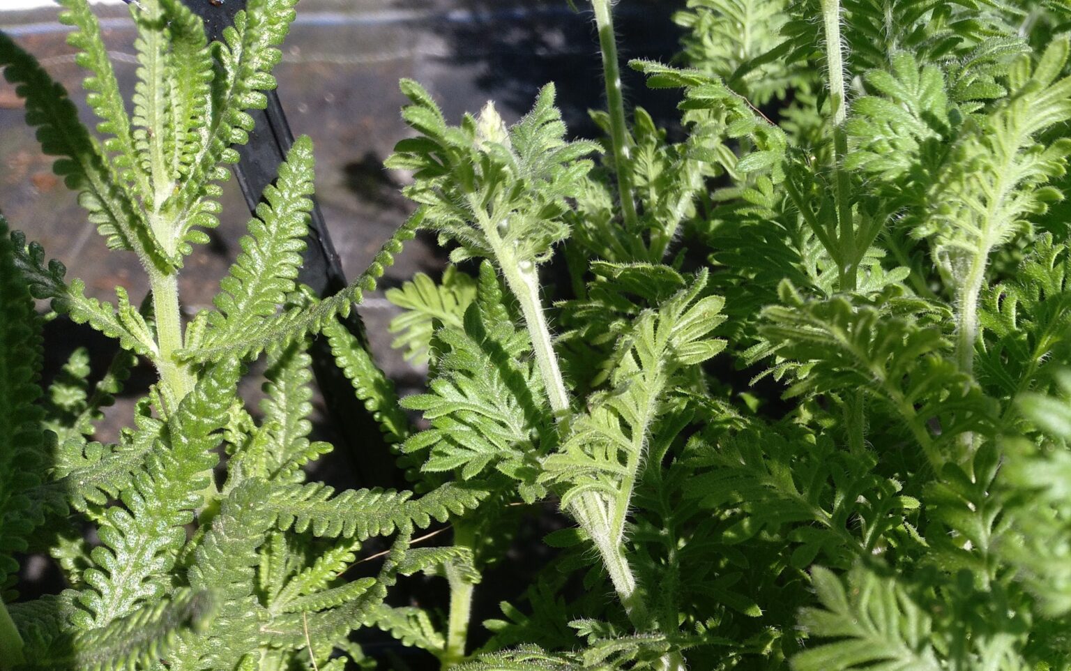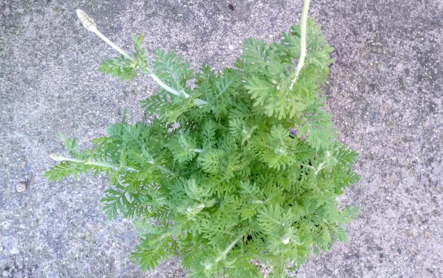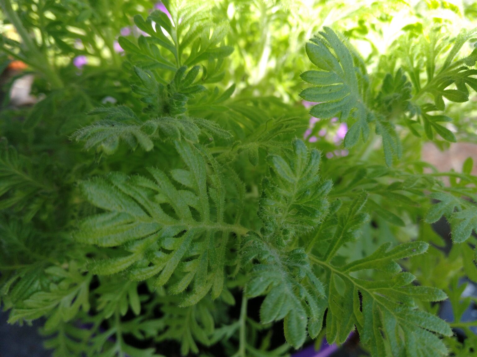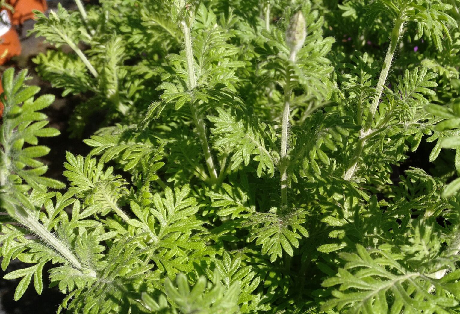 Los tallos son de color verde pálido, tienen forma cuadrangular y son redondeados en las aristas, están cubiertos por una fina pilosidad de color verde claro, que les da una apariencia blanquecina. Las hojas son de color verde pálido, grisáceo o amarillento, tienen forma triangular, son mas anchas en su base y se van estrechando hacia los extremos, están muy divididas en segmentos o lóbulos ovalados, que a su vez se dividen en sus extremos, (similares a las hojas de los Helechos). Las hojas están cubiertas por una fina vellosidad, mas corta que la vellosidad de los tallos y de los pedúnculos o tallos florales. La planta es muy aromática.