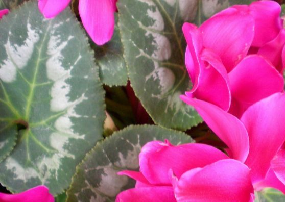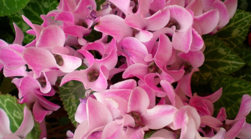 Hay variedades de Cyclamen Persicum con flores de colores extraordinariamente bellos, rosas con bordes blancos, rojos, blanco puro, morados, violetas, e incluso variedades con varios colores en la misma flor, rosas con bordes blancos o con petalos blancos manchados de rosa, todas ellas muy originales y decorativas. Muchas variedades tiene flores olorosas, que desprenden un agradable aroma. Las plantas de Cyclamen presentan a la vez, flores totalmente formadas y muchas otras que se esconden entre sus hojas y se están formando, en mayor o menor estado de madurez. Cuando vayamos a comprarlas, es mejor comprobar si el ejemplar tiene un gran numero de futuras flores formándose entre sus hojas, así nos aseguraremos una floración abundante.