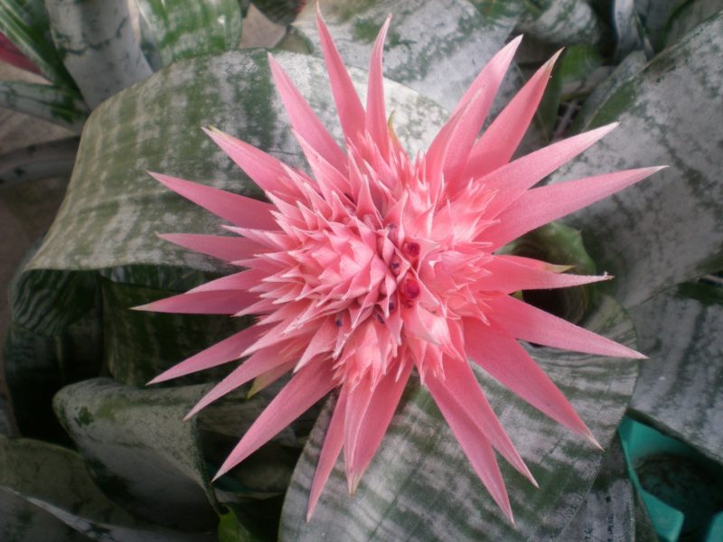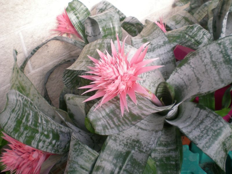 Florece desde final de primavera hasta finales de verano, sus flores son muy bonita redondeadas de color rosa pálido. En el centro de la roseta que forman sus hojas, se desarrolla un tallo grueso, al final del cual crecen numerosas y alargadas brácteas de color rosa, en cuyo interior están sus pequeñas flores azules o lilas. Pueden durar varios meses. Estas plantas necesitan ser adultas para florecer.