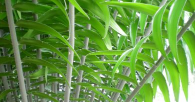 Riegos regulares en primavera y verano con temperaturas altas especialmente en ejemplares jóvenes y recién trasplantados, los ejemplares adultos y bien enraizados necesitan menos riegos, pueden resistir incluso periodos de sequía, Es recomendable dejar secar ligeramente el sustrato entre riegos para evitar empaparlo. En otoño distanciar los riegos a medida que las temperaturas bajen, en invierno necesitan pocos riegos. Es recomendable cortar las hojas inferiores secas a finales de invierno o principios de primavera dependiendo del clima de cultivo.