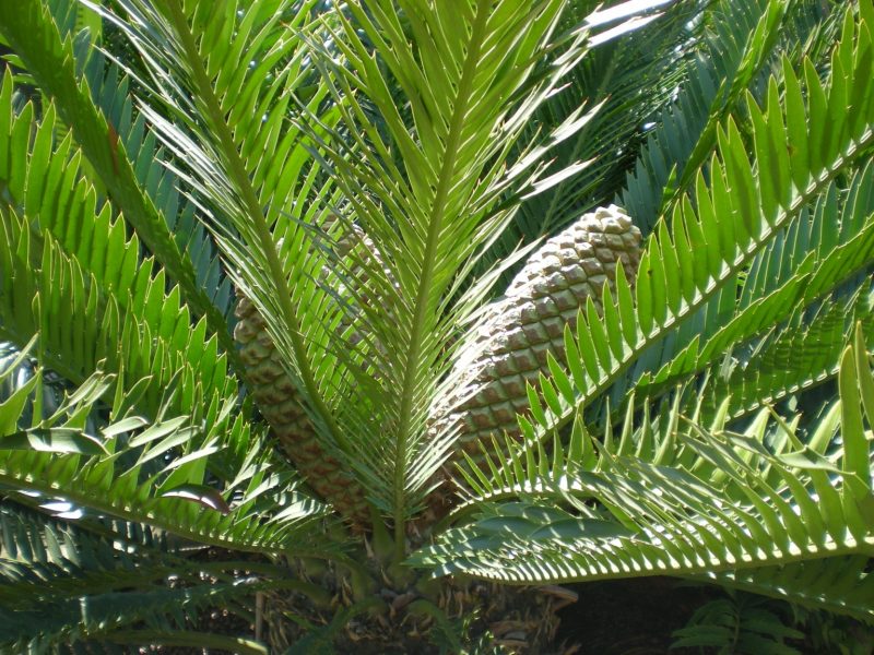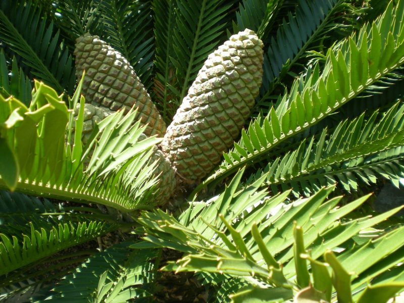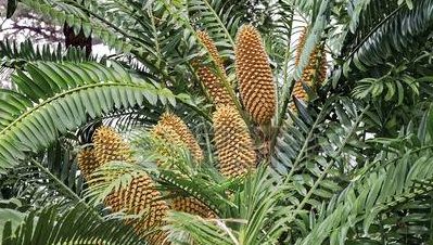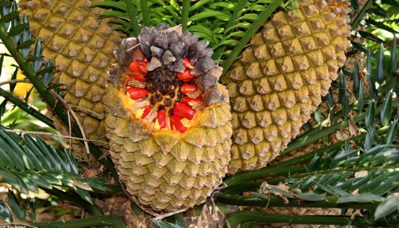 Las plantas adultas desarrollan conos femeninos o masculinos, cada planta puede generar varios conos. Los conos femeninos son ovalados tienen forma ahuevada, se parecen a las piñas en su forma y color, pero su tamaño es mucho mayor. Son de color verde con matices amarillentos, pudiendo superar los cuarenta centímetros de longitud. Los conos masculinos son alargados y cilíndricos de menor tamaño. Para que se desarrollen las semillas, necesitamos ejemplares con frutos femeninos y masculinos para que ocurra la polinización. Las semillas son grandes de color rojo, son ingeridas por los pájaros que ayudan a su propagación.