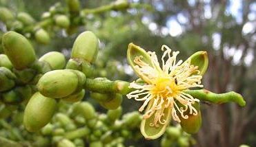 Las plantas adultas florecen, sus flores son blancas amarillentas o crema, surgen en ramilletes horizontales o péndulos de hasta un metro de longitud en la base de la copa de la palmera, por debajo de sus hojas. Un solo ejemplar puede desarrollar frutos, puesto que tiene flores masculinas y femeninas. Los frutos son de color verde, son alargados y globosos, cuando maduran cambian a color anaranjado o rojizo miden alrededor de cinco centímetros de longitud y contienen una única semilla.