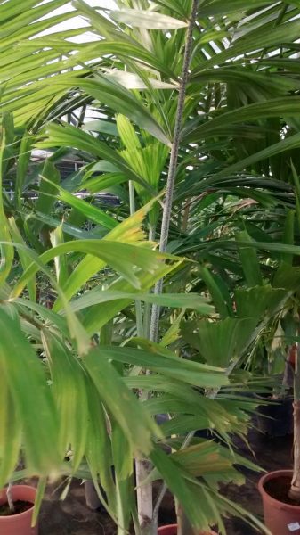 Distanciar los riegos en invierno. En floración es conveniente no descuidar el riego para no perder las flores y en consecuencia los frutos. Es recomendable sembrar las palmeras en lugares protegidos del viento, es muy sensible al viento especialmente si es seco.