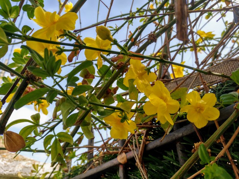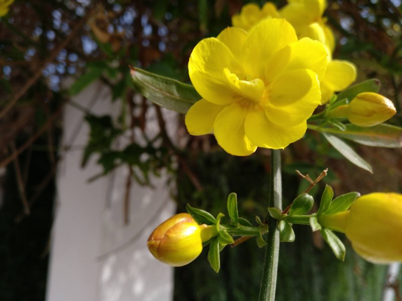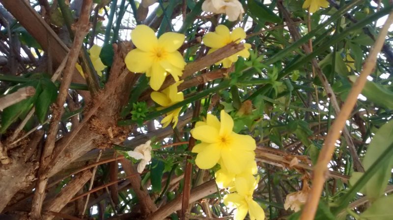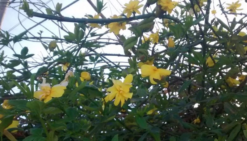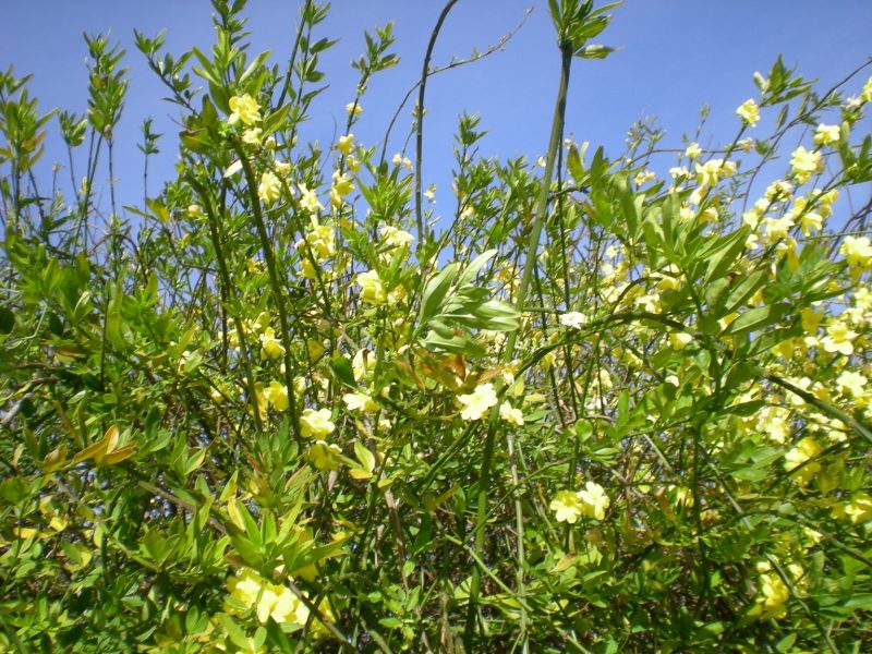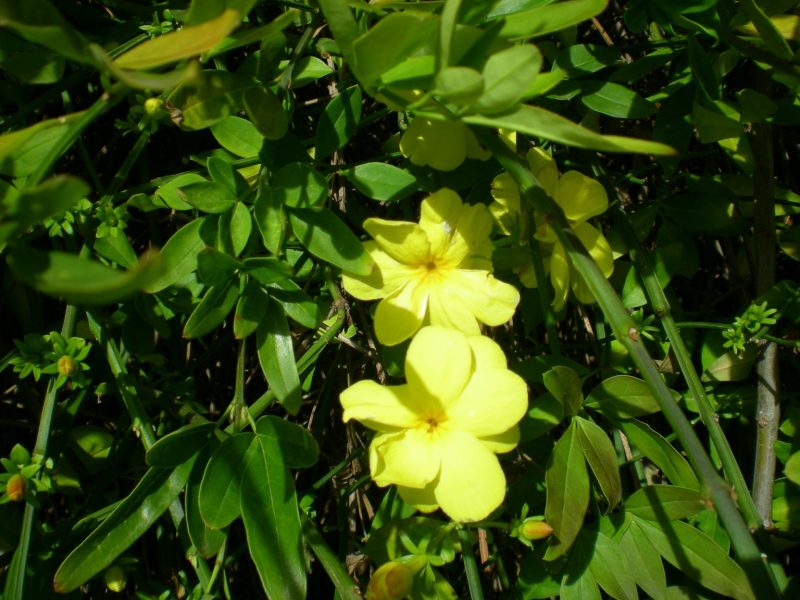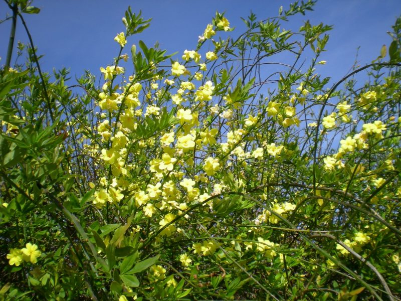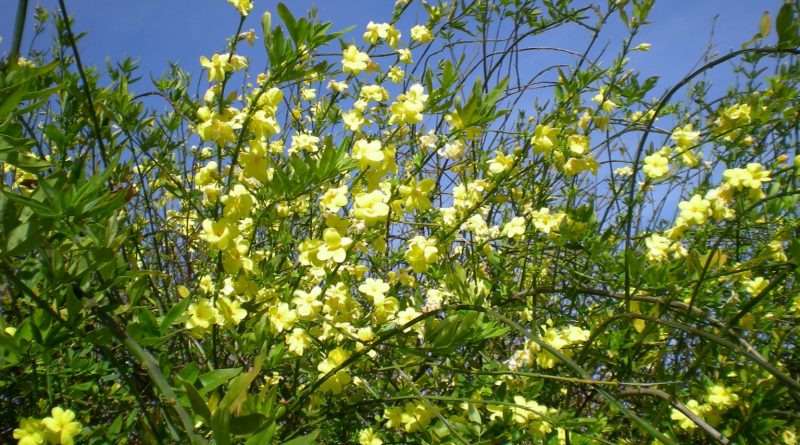 Es el primer jazmín en florecer, florece al final de invierno o al inicio de primavera, sus flores de color amarillo, no son olorosas, pero son muy bonitas de un color amarillo claro muy luminoso. Prefiere una situación soleada o sombra parcial, pero florecera mas intensamente si lo cultivamos a pleno sol.