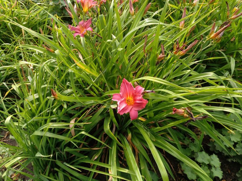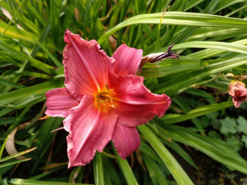 Es una planta refloreciente que da flores por un largo periodo de tiempo, florece de finales de mayo a mediados o finales de verano dependiendo del clima de cultivo. Las flores son grandes de alrededor de seis o siete centímetros de diámetro, son de color purpura y garganta amarilla, los pétalos tienen los bordes ondulados. Las flores duran solo un día por eso la planta es conocida como «Lirio de Día», las flores crecen reunidas en inflorescencias terminales en grupos de dos o tes flores por vara floral. las flores atraen a las mariposas y a los colibríes.