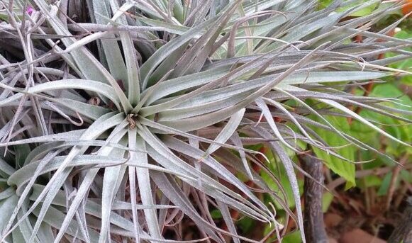 La planta tiene un crecimiento globoso y rápido, en relación con otras variedades de Tillandsias, esta compuesta de numerosas hojas, largas y aplanadas, puntiagudas. Las hojas se desarrollan superpuestas formando una especie de roseta, los bordes laterales de las hojas se inclinan hacia arriba, dejando el centro de la hoja ligeramente hendido, las hojas se curva hacia abajo de forma semejante a las patas de una araña. Las hojas están cubiertas de tricomas que le dan un magnifico aspecto plateado.