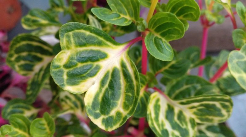 Planta perenne o anual, muy decorativa. Tallos y peciolos de color fucsia, hojas ovaladas y parcialmente divididas en su extremo, de color verde, con nerviaciones o venas y dibujos de color amarillo cremoso. Situación soleada o parcialmente soleada, suelo fértil, ligeramente ácido y bien drenado. Temperaturas moderadas invernales o cultivo en interior.